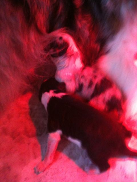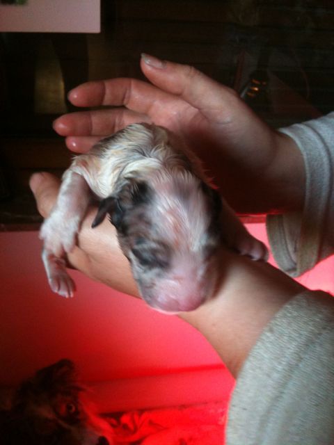 Het is een blue merle pup.Geslacht nog onbekend. Zit nog in de mama wasmachine. 🙂