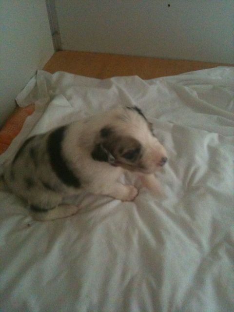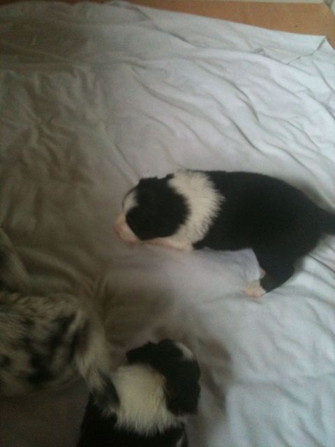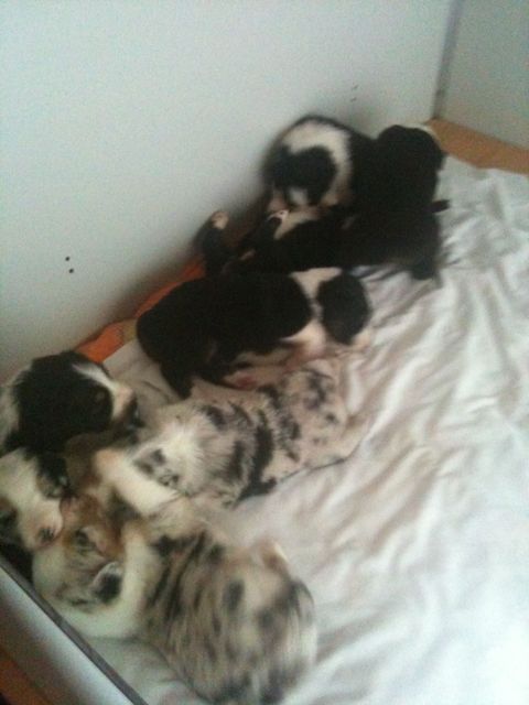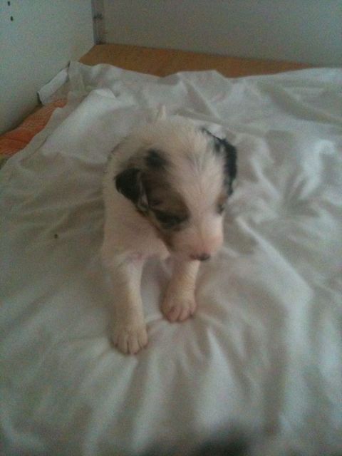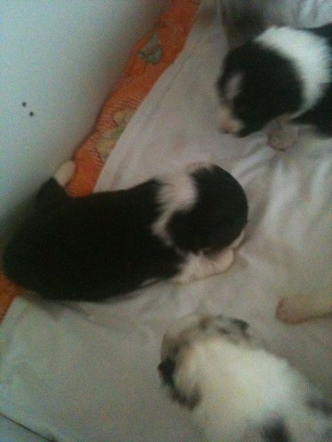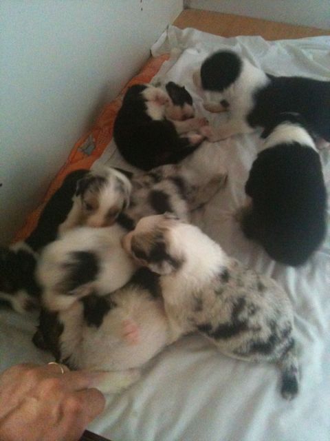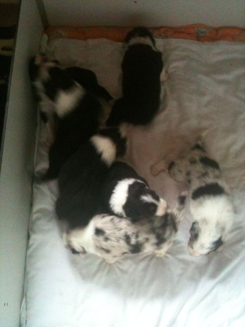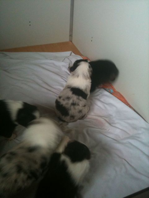 De pups veranderen compleet.De ene dag nog hulpeloos liggen en proberen te stappen.De volgende dag al rollebollen en kleine sprongen uitvoeren.Sinds gisteren krijgen ze melk in een schaaltje bij en het is geweten op de gewichtenschaal.
