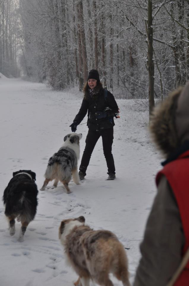 Afspraak was op de hondenschool waar Katrien en Koen ons vanbinnen reeds verwarmden met lekkere jenever (en waar ik reeds de eerste keer tegen de vlakte ging) De honden waren in alle staten. Enkel de Godmother Tinky, haar rechterhand Chey en olijke Willow moesten thuisblijven omwille van reeds opgelopen schade aan de voetkussentjes ten gevolge van de bevroren ondergrond.