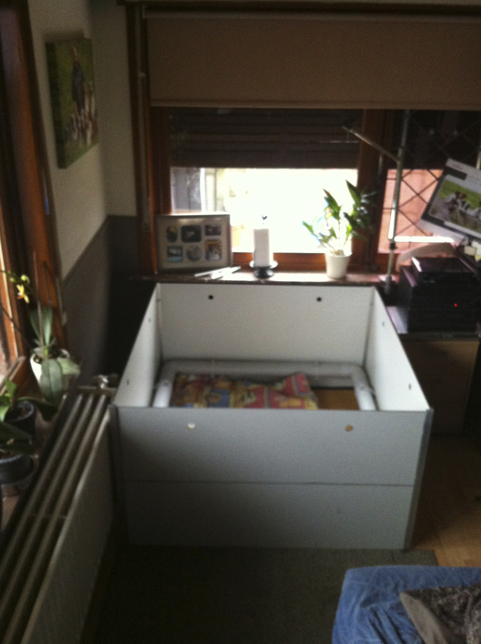 De laatste voorbereidingen hebben zich voltrokken. Werpkist nog een laatste maal afgewassen en ontsmet na een jaar in de berging. En dan alles terug in elkaar schuiven en schroeven in afwachting van de nieuwe kroost. We zijn al begonnen met temperatuur nemen van Cheyenne zodat we toch een kleine hint krijgen op de bevalling. Voorlopig nog alles normaal dus voor vannacht is het al zeker niet 🙂