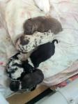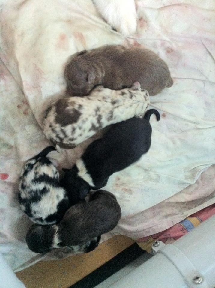De definitieve ‘uitslag’ is bekend. Cheyenne heeft rekening gehouden met ieders wens.Vijf pupjes en allerlei kleuren waaronder enkele specialekes. Ze nam er dan ook haar tijd voor. De dierenarts is geweest en de pupjes en mama zijn gechecked op algemene gezondheid en ze stellen het goed. Ze eten allemaal flink en zijn heel bezig ondanks Chey’s zware nacht. Ze overtreft dan ook alle verwachtingen. We hadden een zeer goed gevoel bij haar moedergevoelens maar je blijft toch steeds een beetje met een klein hartje afwachten. Ze is ongeloofelijk voorzichtig en teder met haar eerste kindjes .