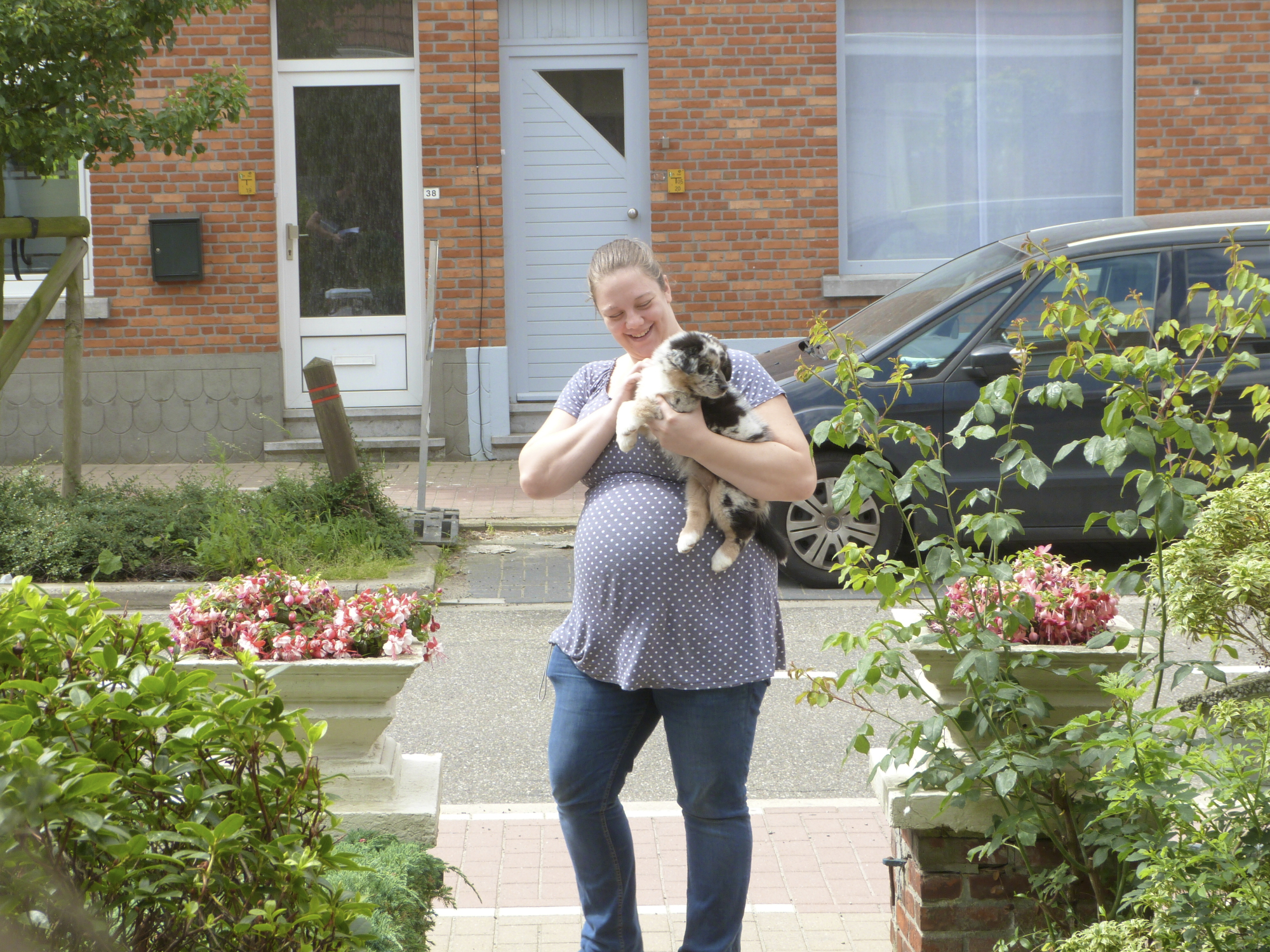 Vandaag zijn we Lexie na 9 lange maanden wachten gaan halen. Na uitgebreid afscheid te nemen van mama, de broertjes en het zusje, oma en opa, zijn we aan onze terugreis, mét Lexie, begonnen. In eerste instantie vond ze het allemaal heel interessant, maar na een kwartiertje begon ze toch een beetje te janken. Toen ze besefte dat dat niets uithaalde, besliste ze de laatste 5 minuten van de rit een oogje toe te pinken. Eenmaal thuis aangekomen hebben we haar een plasje laten doen, een beetje laten drinken, en dan samen met het speeltje met de nestgeur wat in de bench laten rusten. Terwijl zijn wij Gino, onze beauceron, wat gaan moe maken. Daarna hebben wij hun kennis laten maken. In eerste instantie kwam Gino afgestormd, en nog voor dat hij bij Lexie aankwam, jankte Lexie even, waardoor Gino besefte ‘oei, ik moet hier voorzichtig mee zijn’ en toen ging hij heel rustig eens snuffelen en kijken. In het begin vond Lexie dit allemaal maar raar, maar gaandeweg betrapte we haar erop dat haar staartje ging waggelen :-). Uiteindelijk ging het eigenlijk zo goed dat we een uitgebreide foto-sessie hebben kunnen doen… Erna zijn we naar binnen gegaan, waar Lexie direct haar plekje onder de stoel van haar baasje opeiste. Nu gaan ik lekkere brokjes met duck klaarmaken en dan kan ze nog even slapen, want straks komen mijn mama, mijn zus en haar kleintje een kort puppiebezoekje brengen…