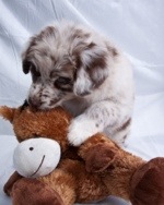 Na een autorit van ongeveer een uurtje, waarbij Lilly een heus concert gegeven heeft, kwamen we thuis aan. We hebben haar onmiddellijk op haar plekje gezet waar we willen dat ze in de toekomst haar plasje moet gaan doen. En op het gehoorde Martine-commando “pipi pipi pipi” was het klusje snel geklaard. Vervolgens hebben we haar wat kennis laten maken met de omgeving. Een snelle hap voor ons maar onder toeziend oog alles verkennen, ook de andere puppy die in het raam getekend staat. Helaas blafte deze stranger niet terug.