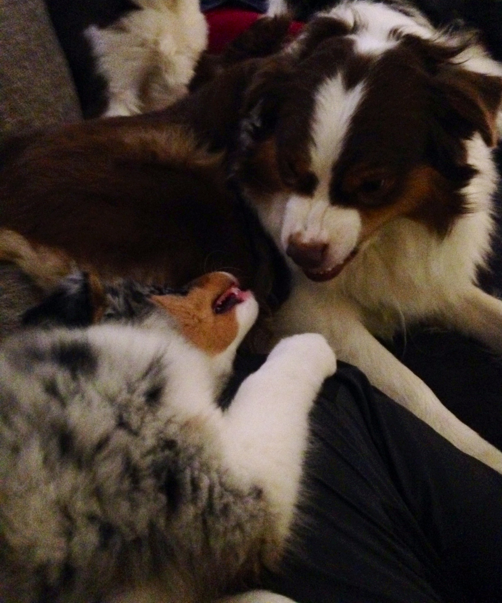 Deze was aan een koe hoefje aan het knabbelen en wilde duidelijk niet delen met zo’n waggel ding. Drusilla -met hoofd in de grond- had niet gezien dat Moonwalker geruild was met een pupje van eigen maak ;-). Nadat ik in de woonkamer kwam keek ze op en zag je haar boze blik als sneeuw voor de zon verdwijnen. ” ooh, dit is eigen volk” zag je ze denken. Snel een lik over de pup om het goed te maken.